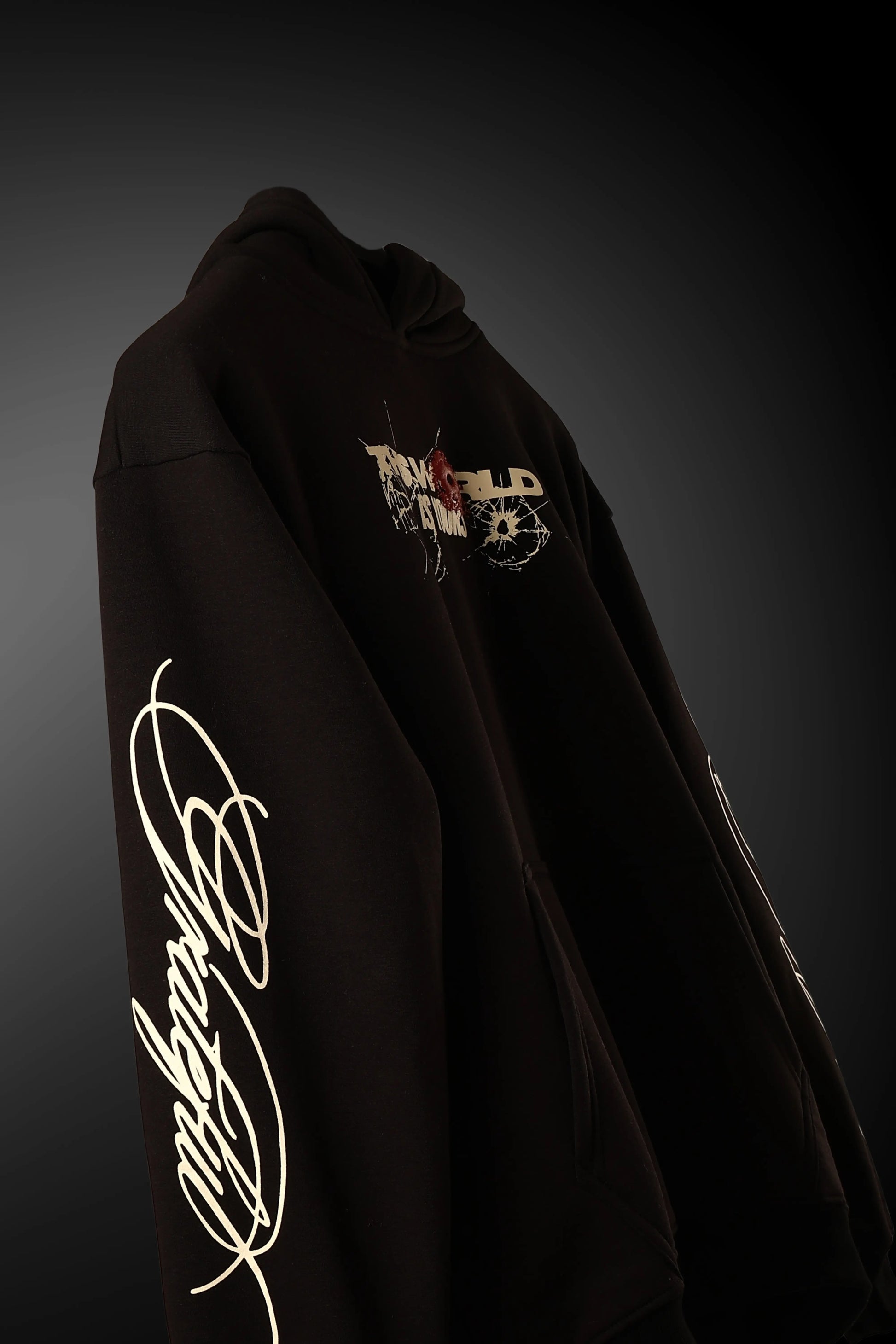 The front hits first: THIS WORLD IS YOURS stamped across the chest, surrounded by bullet marks and a bold red puff-printed strike on the “O.”