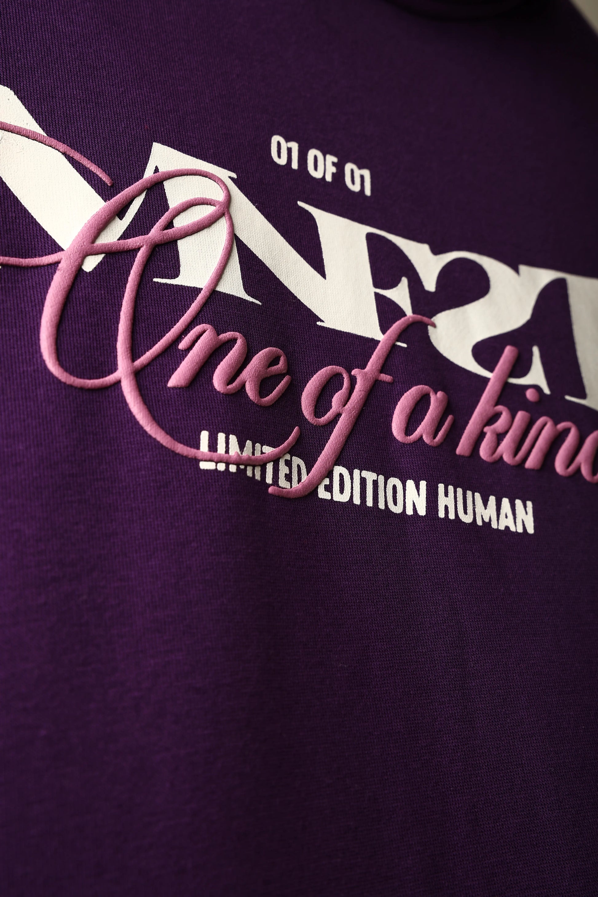 This Purple hoodie is made for the ones who walk in self-awareness, not insecurity. The front flexes the MNFST logo layered in puff and print — marked 01 of 01, One of a Kind, Limited Edition Human. You weren’t made in bulk. You were made on purpose.